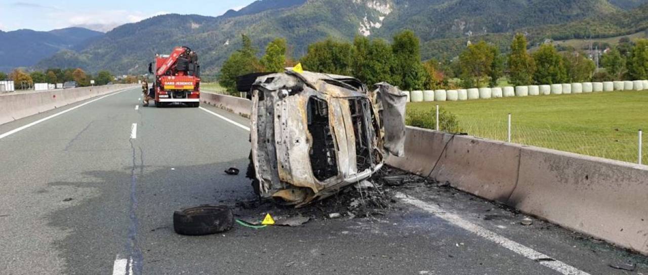 Voznik je trčil v odbojno ograjo, osebni avtomobil se je ob trčenju prevrnil in zagorel, so sporočili s Policijske uprave Kranj.