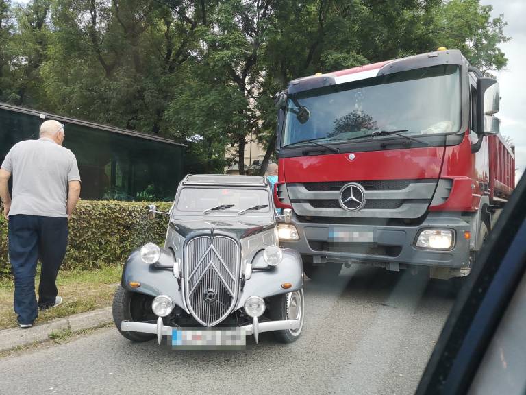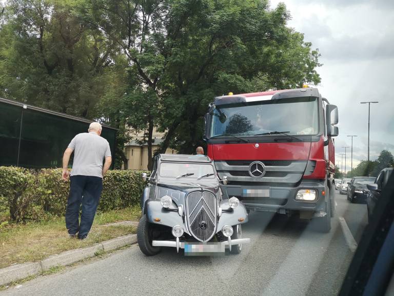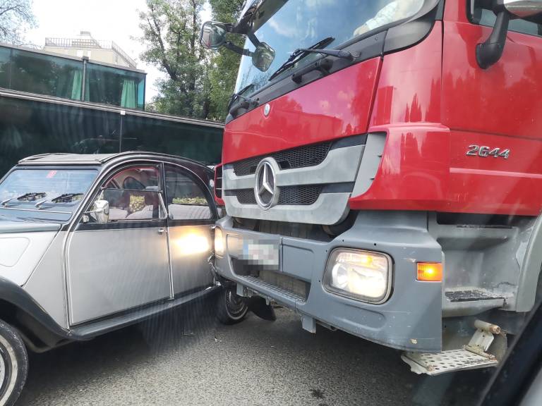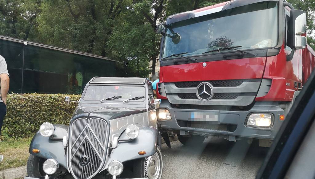 V prestolnici se je zgodila prometna nesreča. Trčila sta tovornjak in starodobnik.