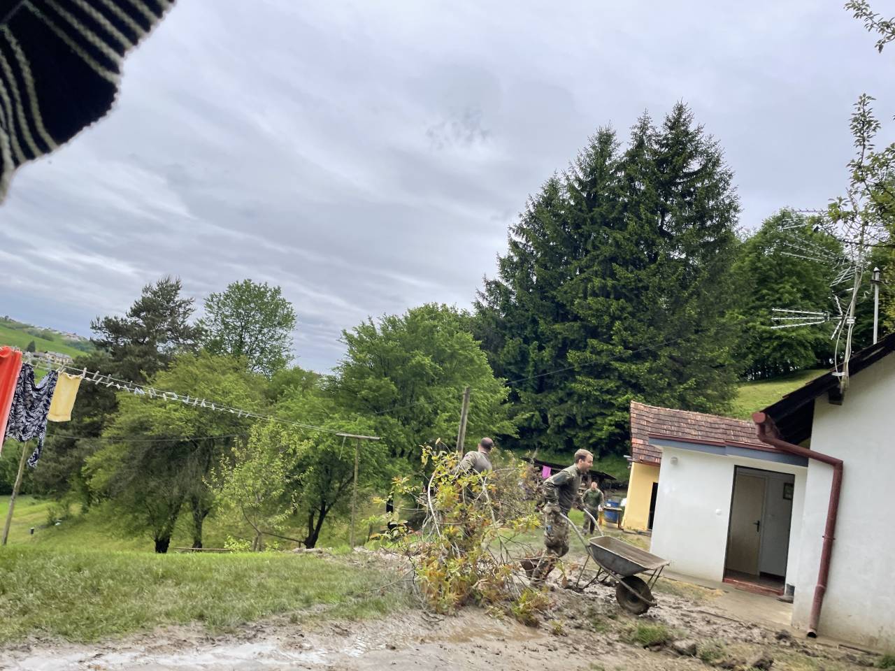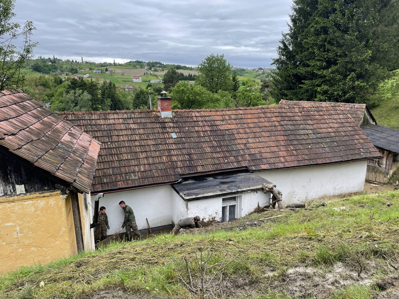 Vojaki ročno kopajo zemljo, saj zaradi težko dostopnega terena do hiše ne morejo z mehanizacijo za sanacijo.