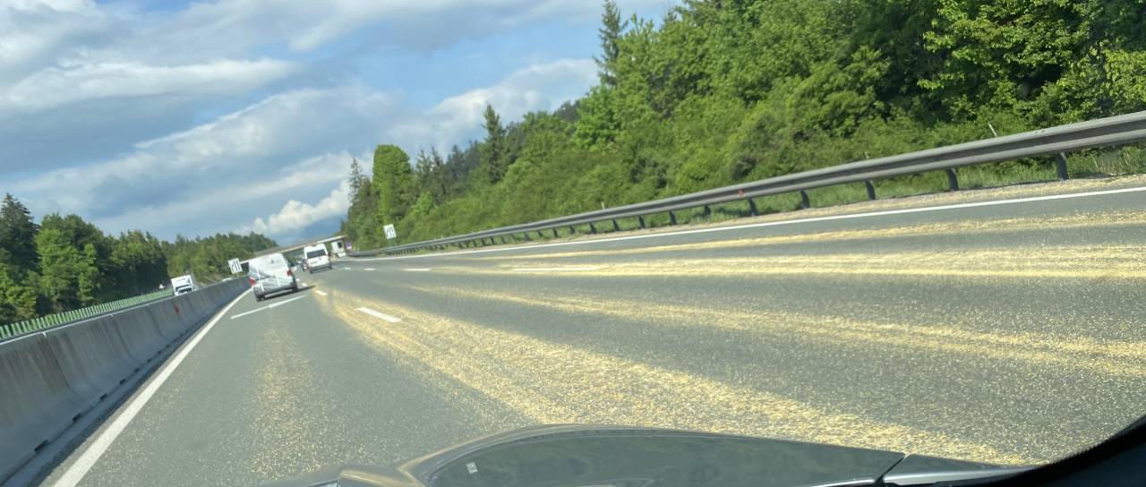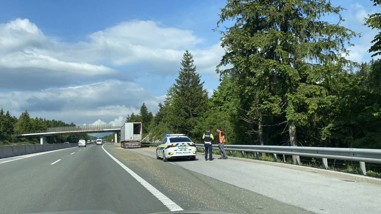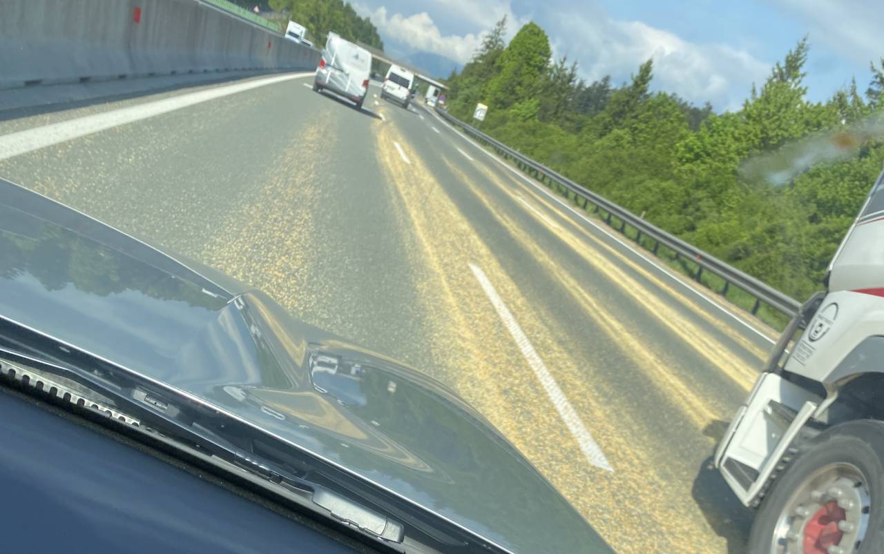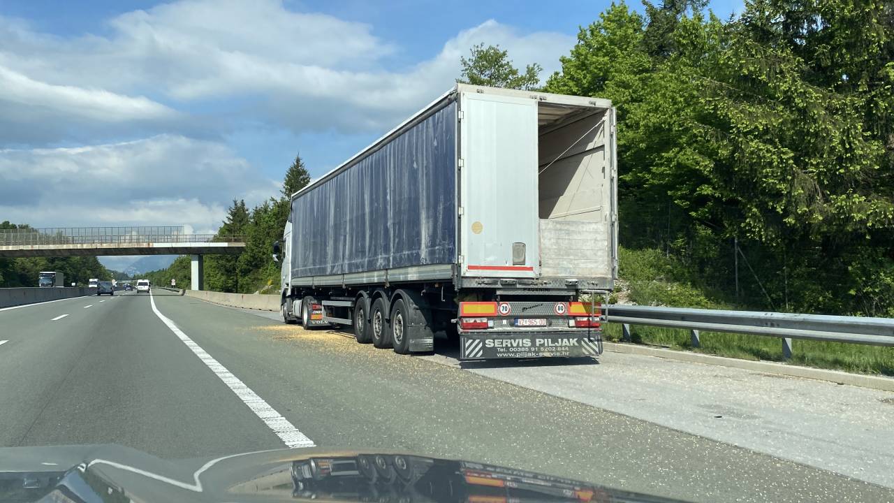 Na primorski avtocesti med Uncem in Ravbarkomando v smeri proti Kopru je po vozišču stresena koruza.