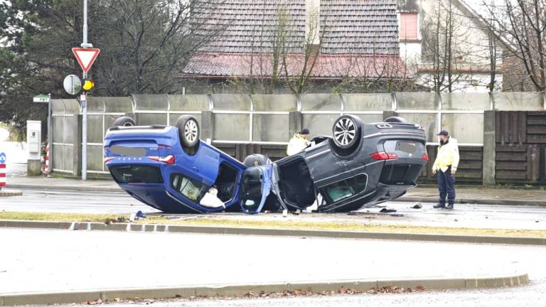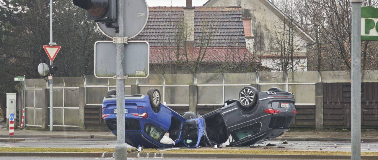 Trčil je v drugo vozilo, pri čemer sta se obe vozili prevrnili na streho.