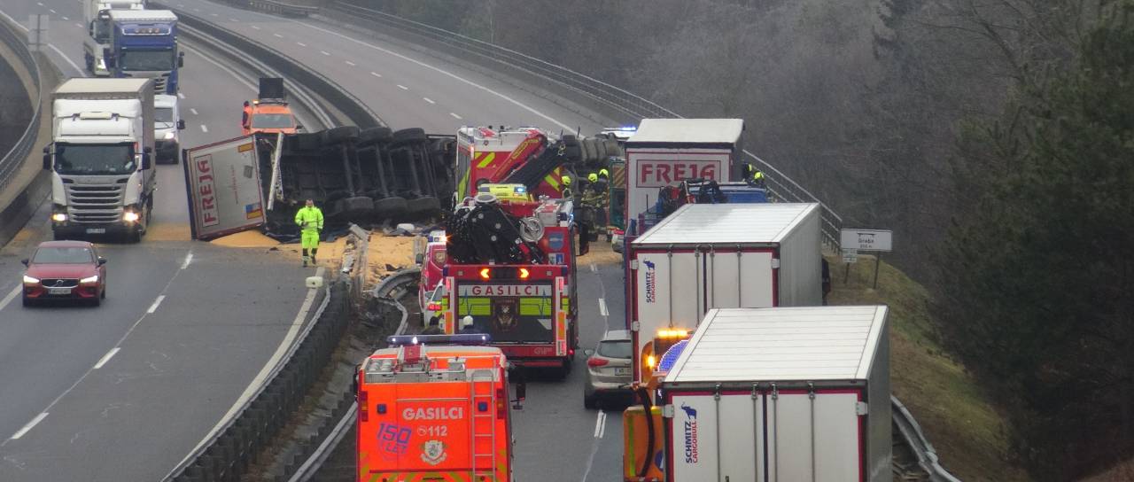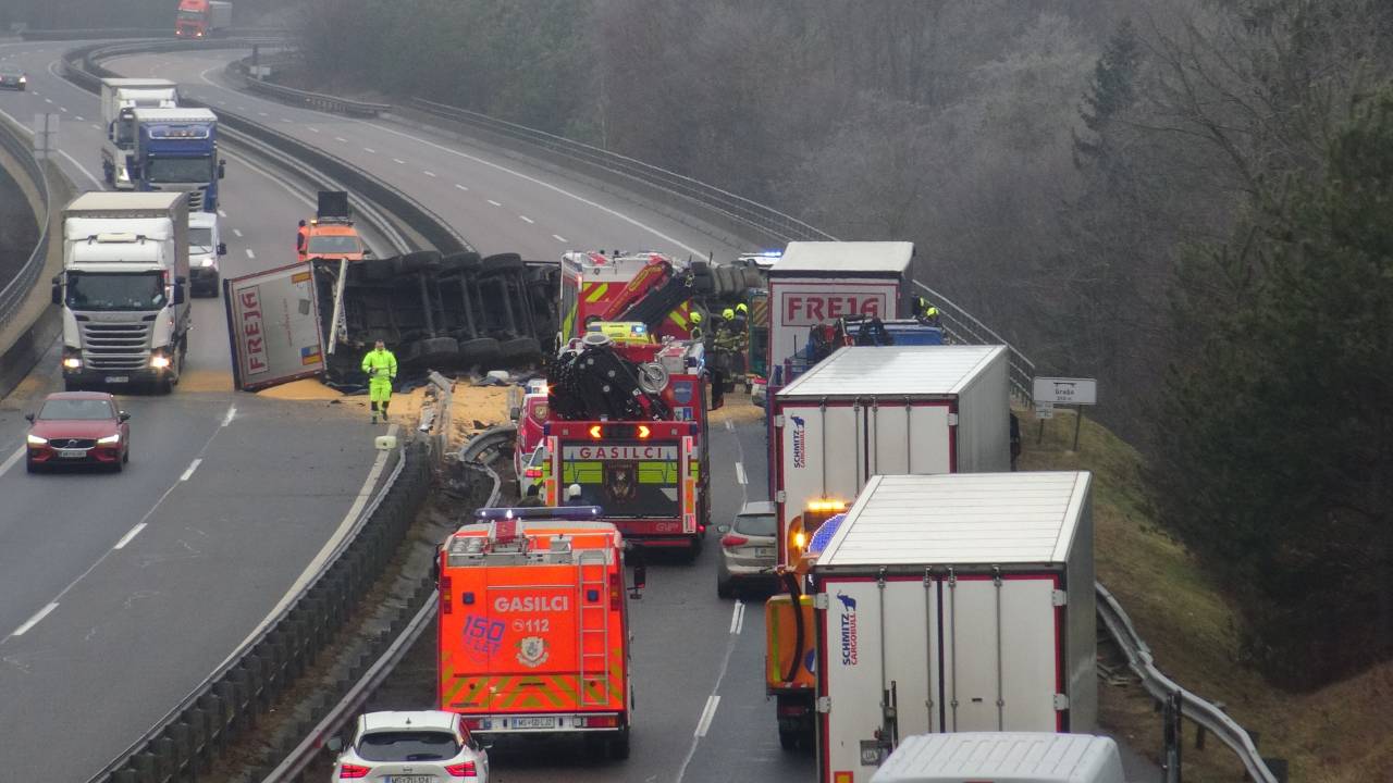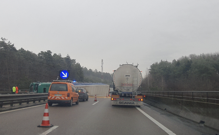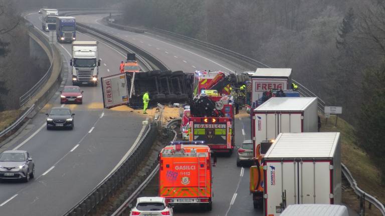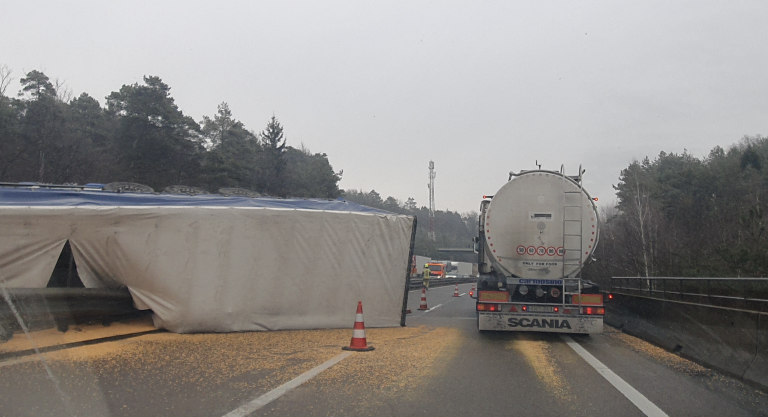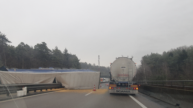 Policijska uprava Murska Sobota je zdaj potrdila, da so bili policisti danes, ob 9.10, obveščeni, da se je na pomurski avtocesti, malo naprej od Vučje vasi v smeri Maribora prevrnilo tovorno vozilo tujih registrskih oznak, ki je prebilo tudi zaščitno ograjo.