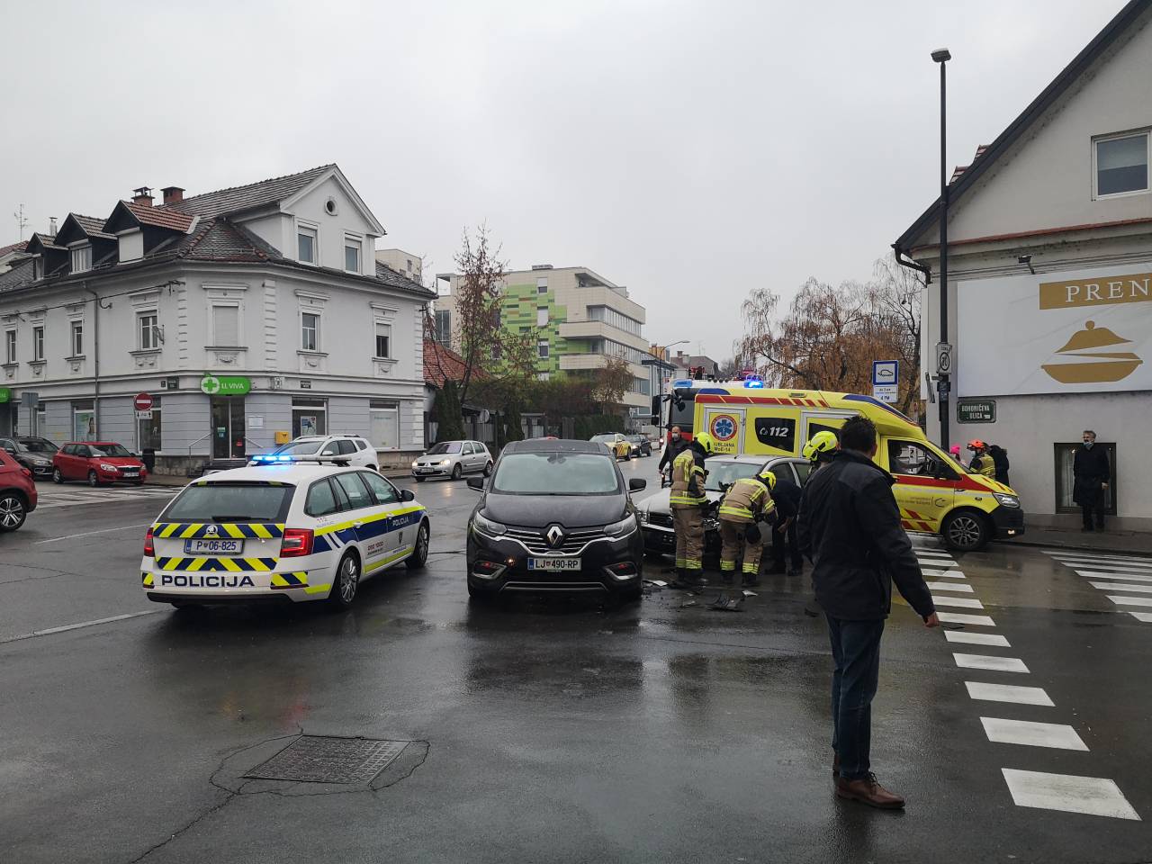 Za zdaj so s policijskim vozilom zaprli cesto na Bohoričevi ulici. Rešilni avtomobili, ki so na poti v ljubljansko bolnišnico, pa že čakajo v koloni.