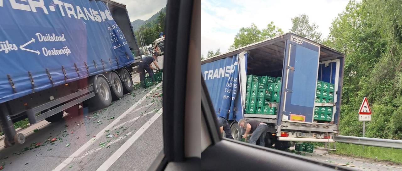 Tovornjaku se je med vožnjo odprla leva stranica na prikolici, več tisoč steklenic piva je zletelo na cesto.