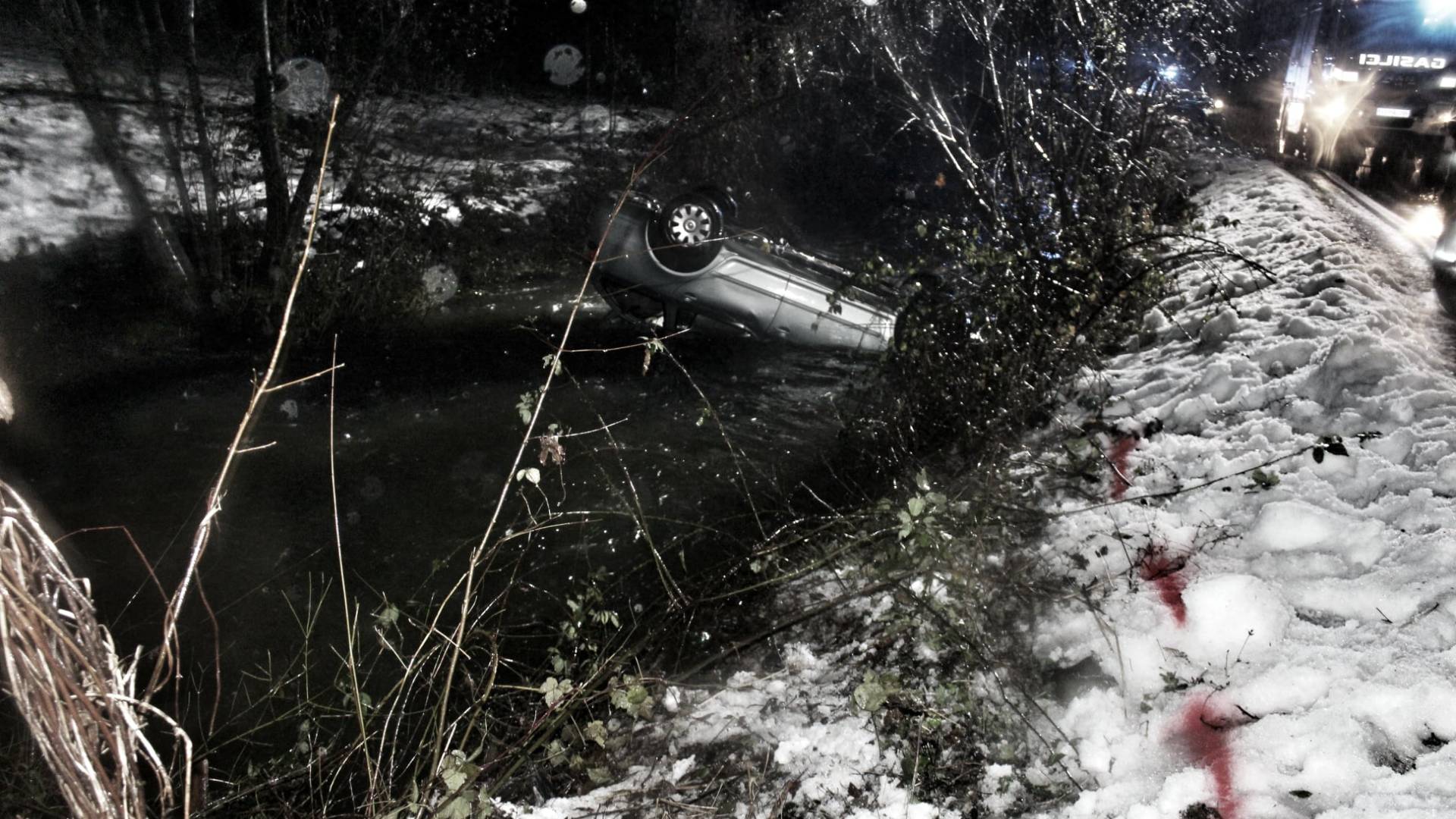 Gorenjski policisti so obravnavali prometno nesrečo v kateri je voznica zaradi močnega vpliva alkohola (rezultat preizkusa alkoholiziranosti 0,91 mg/l) in posledično nepravilne strani vožnje s ceste zapeljala v približno pol metrski potok in se z osebnim avtomobilom prevrnila na streho. Stekla v vozilu so počila in vanj je začela vdirati voda.