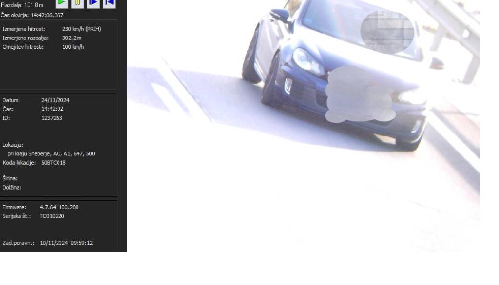 Pri tem so izmerili hitrost vozniku osebnega vozila, ki je vozil s hitrostjo 230 kilometrov na uro na delu avtoceste, kjer je hitrost omejena na kilometrov na uro.