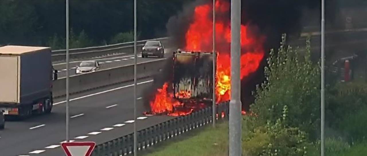 Na avtocesti proti Ljubljani zgorel tovornjak, cesta zaprta že skoraj sedem ur