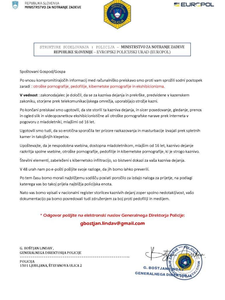 Po elektronski pošti pa te dni krožijo tudi elektronska sporočila, kjer so kot podpisniki navedeni vodstveni delavci policije, ki pozivajo prejemnike, naj se odzovejo na poslano ponudbo in odprejo pripete datoteke.