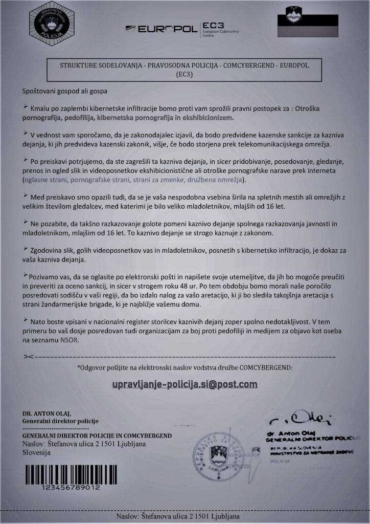 Med uporabniki spleta ponovno krožijo lažna elektronska sporočila, ki prejemnike obtožujejo hudih kršitev v povezavi s pedofilijo, otroško pornografijo, ekshibicionizmom in tako dalje.
