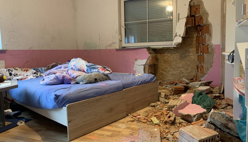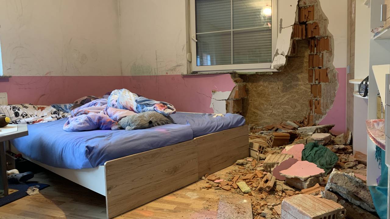 Zidake in dele stene je vrglo nekaj metrov v notranjost otroške sobe, kjer sicer spita 8- in 9-letni sestri, ki ju k sreči v trenutku trčenja ni bilo v postelji.