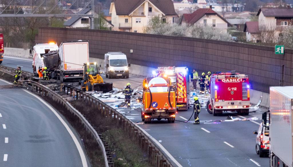 Po ponedeljkovi prometni nesreči je na primorski avtocesti med Vrhniko in Brezovico še vedno zaprt prehitevalni pas v obe smeri.