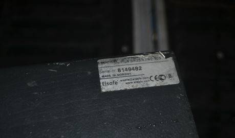 Na levi bočni strani sefa je v kotu nameščena siva nalepka z napisom SENTINEL Plus SP 25/41/49-805, serijska številka: 81494, Made in Norway, Elsafe.