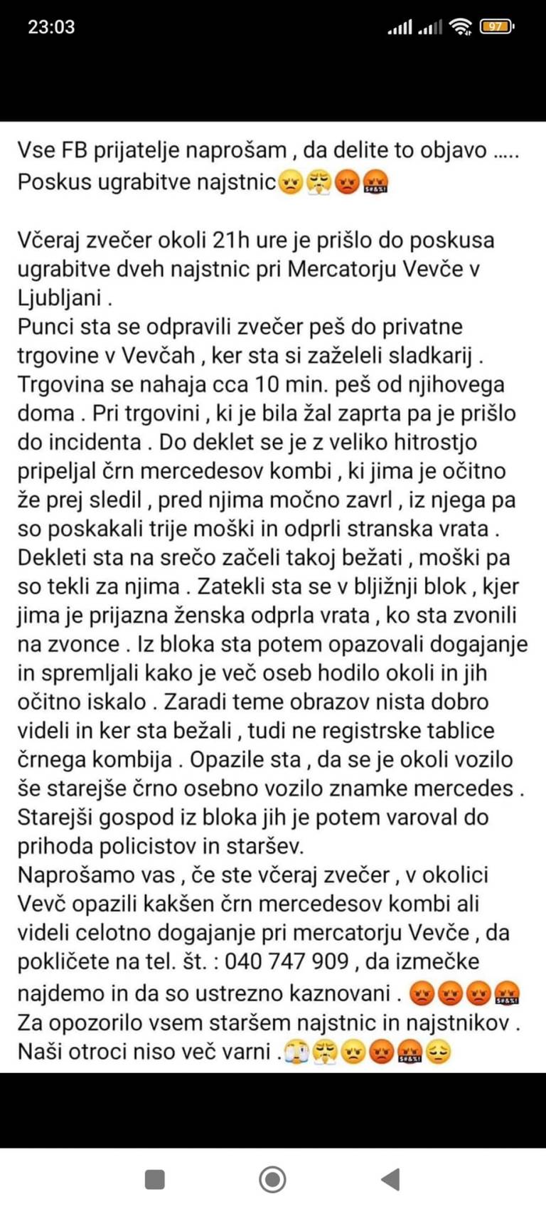 Ti naj bi se odpravili do trgovine, do katere imata peš približno deset minut, je mogoče prebrati v objavi, ki se deli po družbenih omrežjih. Pri sicer zaprti trgovini pa naj bi jima pot presekal črn mercedesov kombi, menda starejšega letnika, ki naj bi jima že prej sledil.
