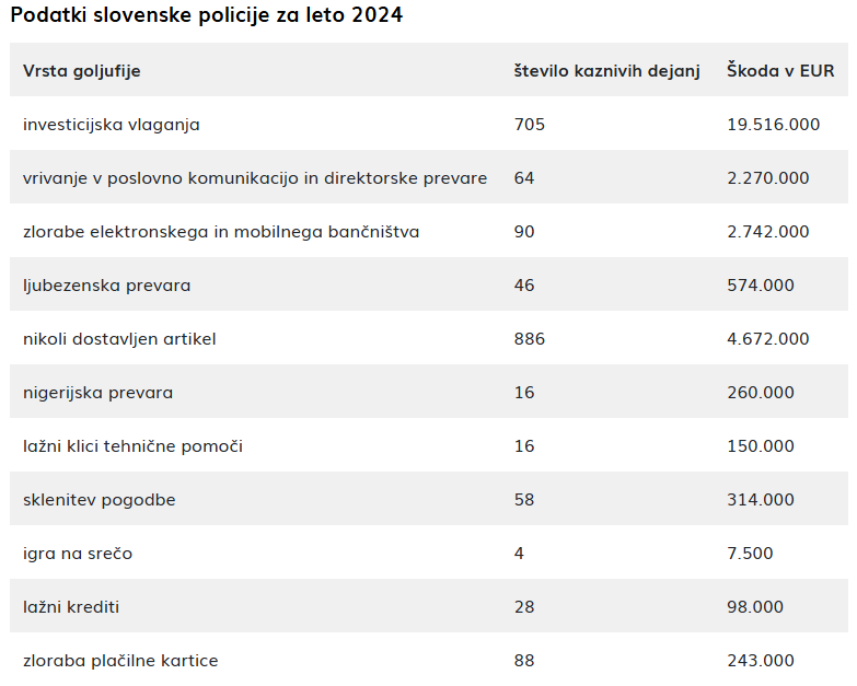 Podatki slovenske policije za leto 2024 dodatno potrjujejo obseg težave. Pri investicijskih prevarah so zabeležili 705 kaznivih dejanj, skupna škoda pa je presegla 19,5 milijona evrov.