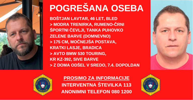 Pogrešan je 46-letni Boštjan Lavtar z Bleda. Od doma je odšel včeraj dopoldan. Uporablja osebni avtomobil BMW 530 sive barve kranjskega registrskega območja. Visok je okoli 175 centimetrov, močnejše postave, ima kratke lase in bradico. Domnevno je oblečen v modro trenirko, rumeno-črne športne čevlje in tanko puhovko zelene barve. Lahko bi se nahajal tudi na območju Novega mesta ali Kopra.