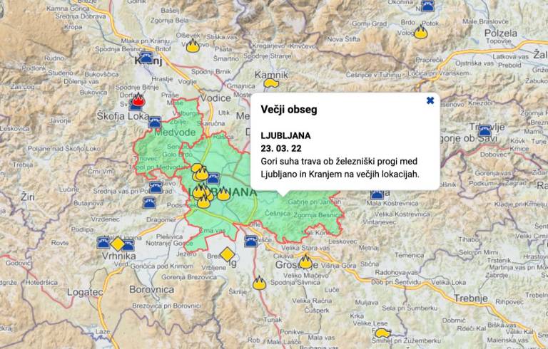 Na več lokacijah ob železniški progi med Ljubljano in Kranjem je gorela suha trava, teh lokacij je bilo po poročanju Uprave Republike Slovenije za zaščito in reševanje kar 14, in sicer na območju v dolžini okoli 30 kilometrov.