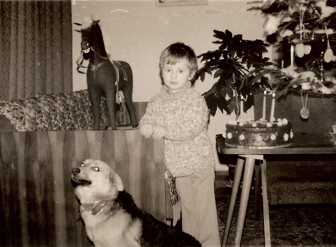 "Tretji rojstni dan v šolskem stanovanju nad Donačko goro v družbi našega psa Civila, ki je dobil ime po psu Civilu iz detektivske serije na televiziji. Čez čas smo sicer ugotovili, da nimamo Civila, ampak Civilo, ki je bila naš prvi ljubljenček. Še danes imam doma psa. Leseni konjiček za mano se danes nahaja v našem muzeju v zbirki otroško življenje."
