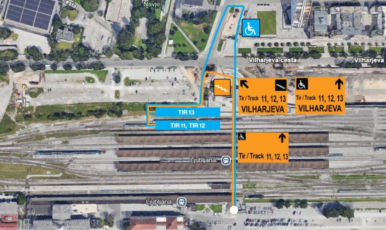 Za osebe z omejeno mobilnostjo je urejen dostop skozi podhod pod Vilharjevo cesto in nato nazaj, po Železni cesti (modra črta).