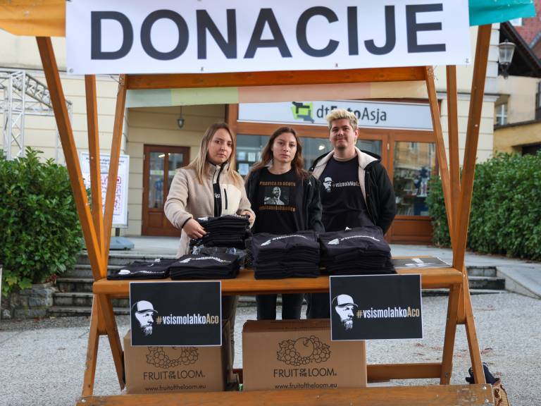 16.03 Na stojnicah ponujajo majice in šilt kape #vsismolahkoaco ter zbirajo prostovoljne prispevke oziroma donacije za družino pokojnega. Protestniki, ki se zbirajo, nosijo majice Acotu v čast z napisom Vsi smo lahko Aco.