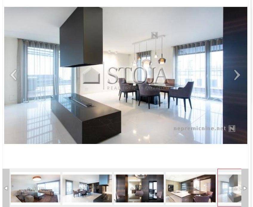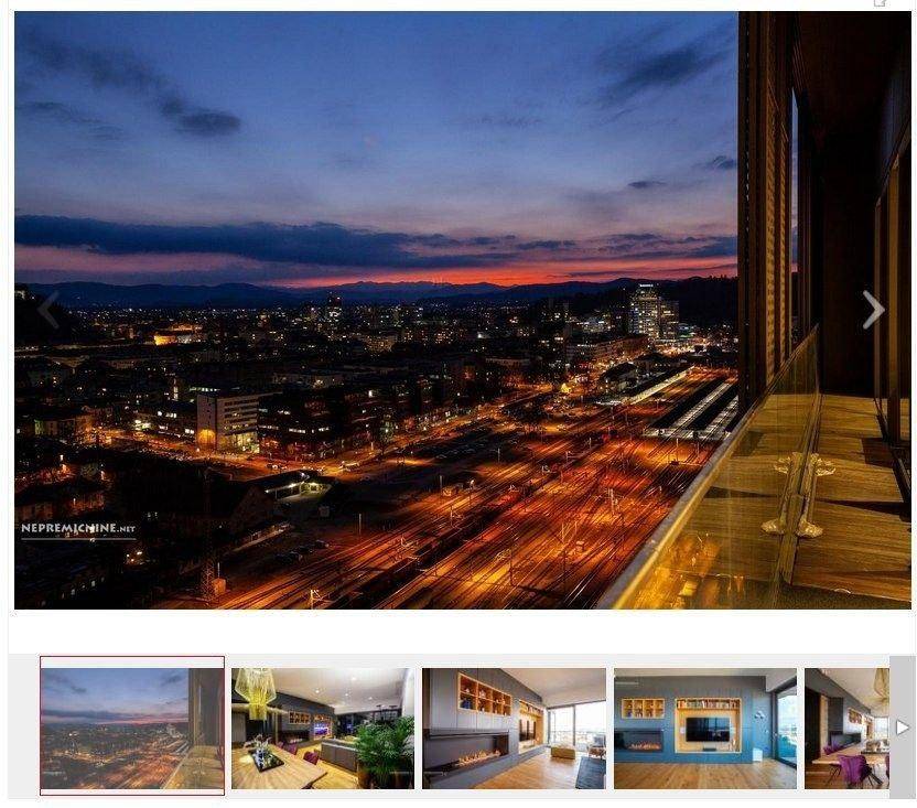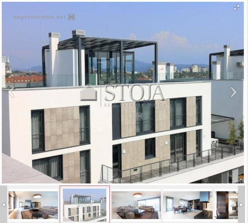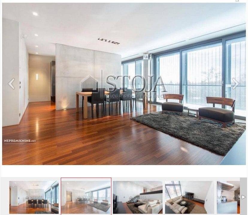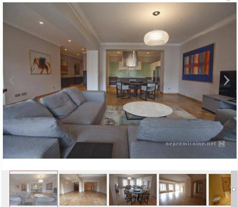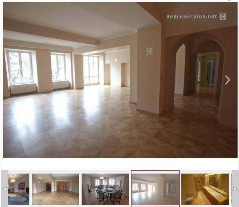 V centru Ljubljane prodajalec za 1,25 milijona evrov kupcu obljublja: veliko predsobo z garderobnimi vgradnimi omarami in odprt večnamenski prostor, dnevni prostor, jedilnico, kuhinjo Bulthaup z vrhunskimi aparati Gaggenau, utility s pralnim in sušilnim strojem Miele, wc za goste, 2 spalnici z lastnima kopalnicama in 1 spalnico z razkošno kopalnico s tušem in kadjo. Vse spalnice imajo vgradne garderobne omare, stanovanju pripadajo tudi 3 parkirna mesta v podzemni garaži in kletna shramba. Stanovanje je klimatizirano. V stavbi je dvigalo.