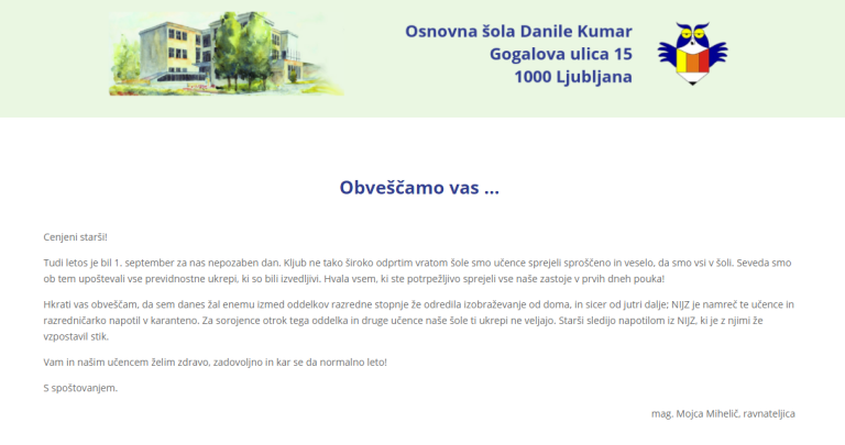 Kot je razvidno iz obvestila ravnateljice šole mag. Mojca Mihelič, je dotičnemu razredu že odredila izobraževanje od doma.