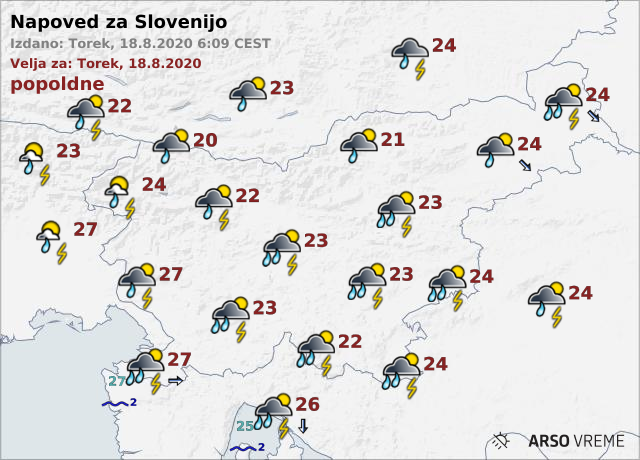 Danes bo spremenljivo do pretežno oblačno, sredi dneva in popoldne bodo pogoste plohe in nevihte. Ponekod bo zapihal severni do severozahodni veter. Najvišje dnevne temperature bodo od 20 do 25, na Primorskem do 27 stopinj Celzija.