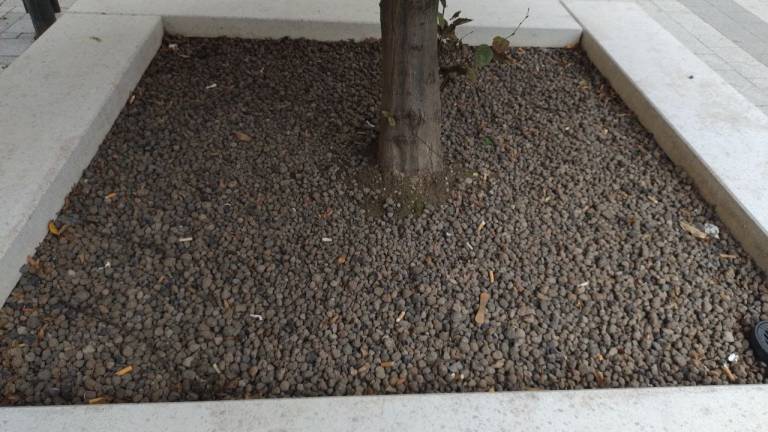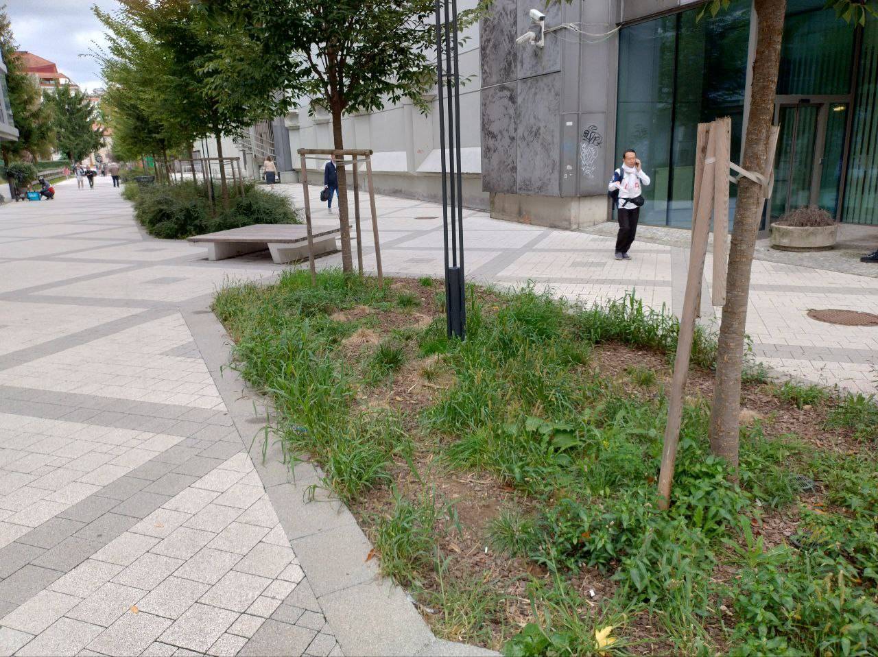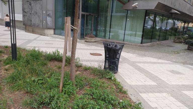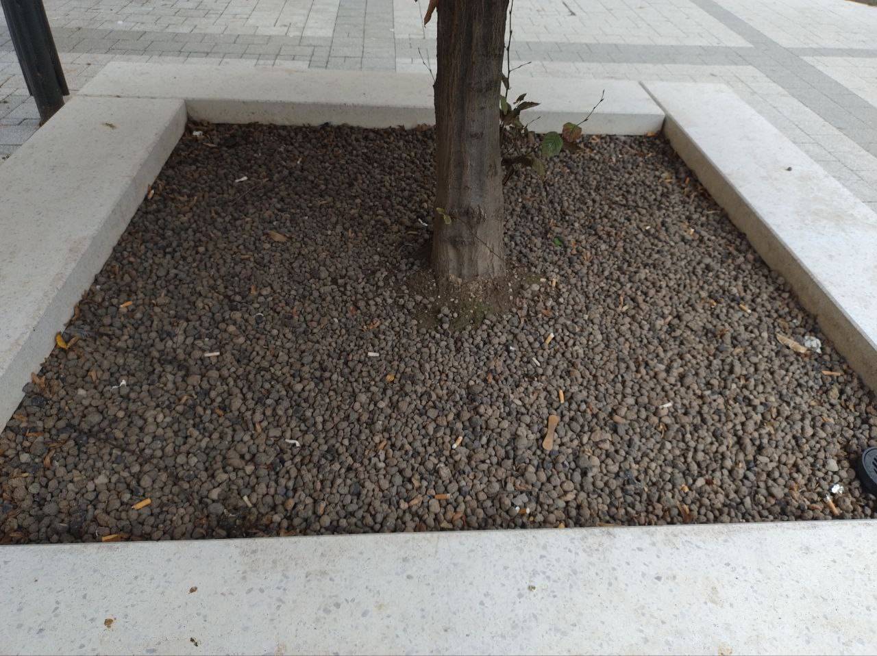 Bela betonska korita za drevesa med Kolodvorsko in Miklošičevo so umazana, prav tako beli betonski deli klopi.