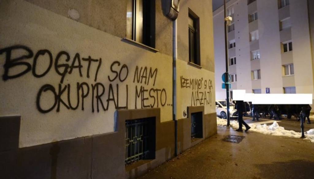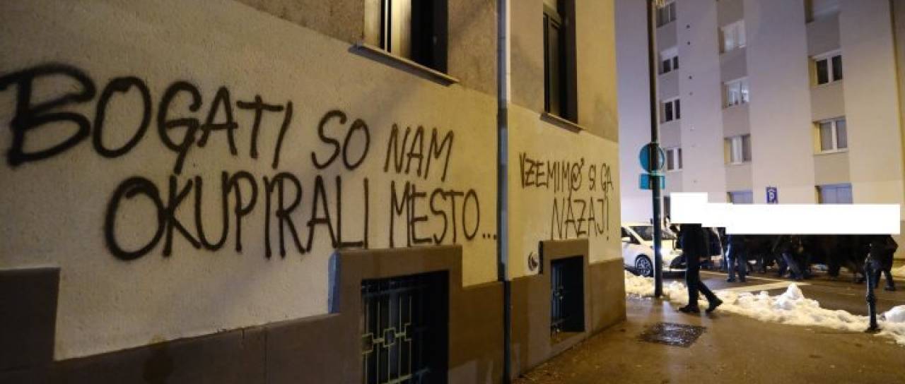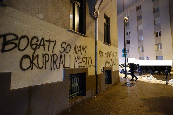 Priloženi sta fotografiji dveh svežih grafitov, en se nahaja v neposredni bližini ljubljanske tržnice, drugi v blokovskem naselju v centru mesta, na njiju pa piše »Bogati so nam okupirali mesto, vzemimo si ga nazaj« in pa »Ne morem živet v Airbnbju«.