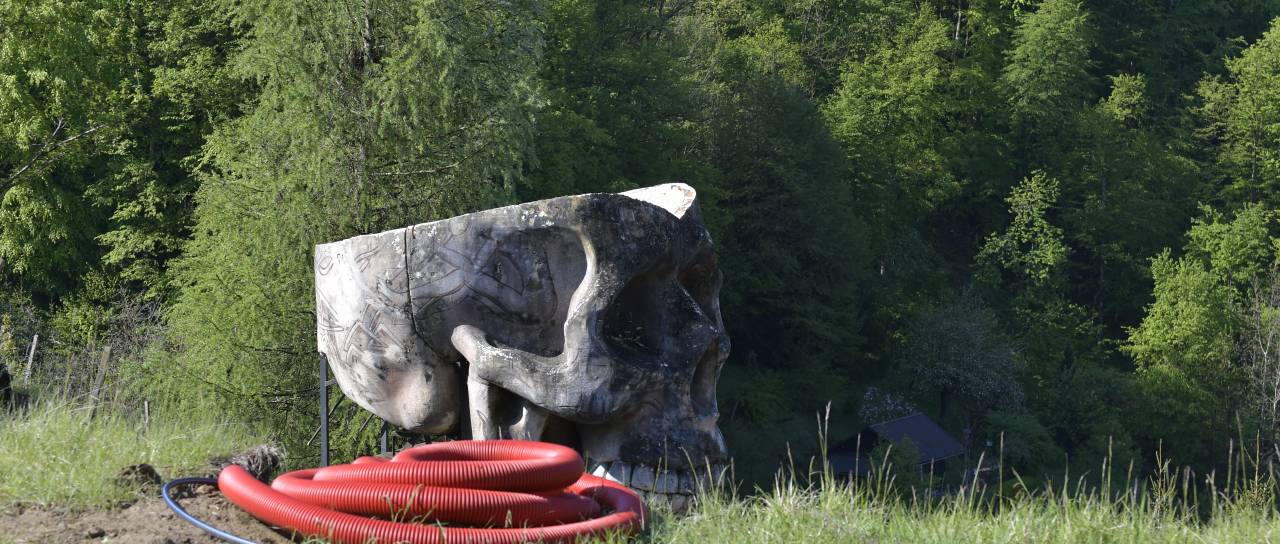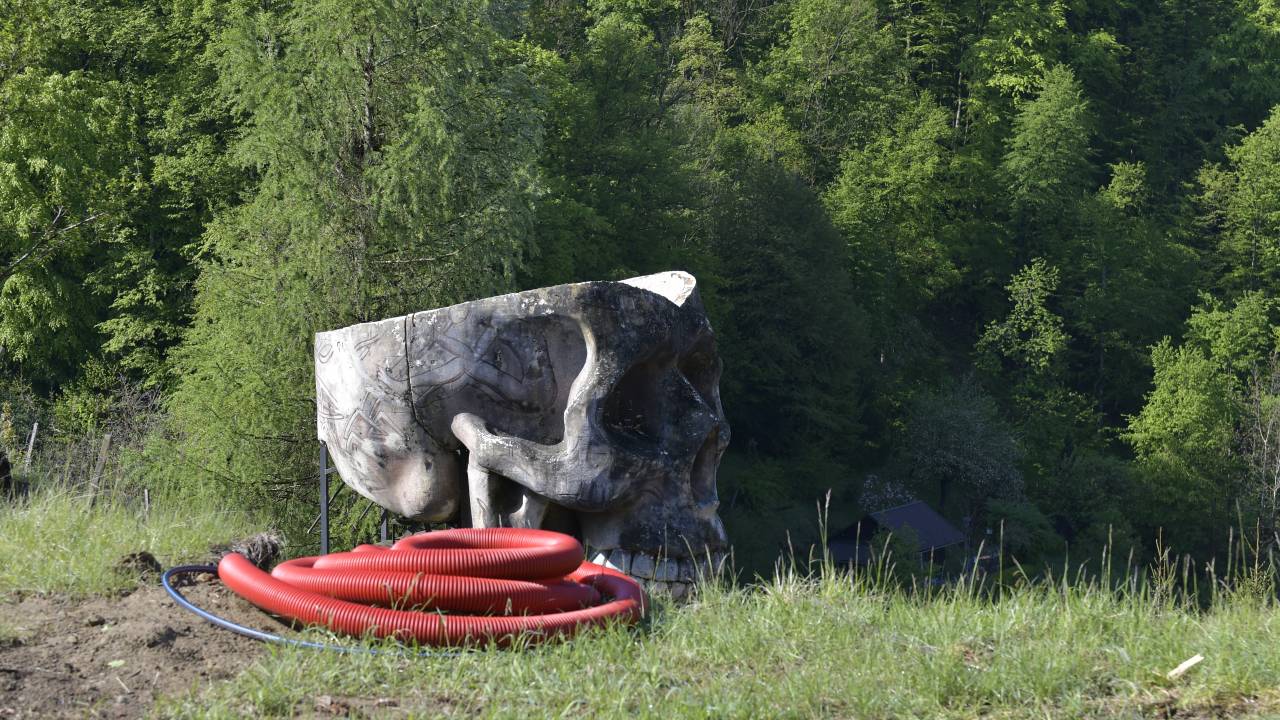 V naselju Plintovec v občini Kungota sodeč po fotografijah, ki nam jih je poslal bralec, stoji ogromna lobanja.
