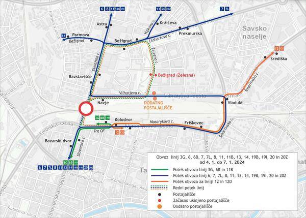 Priporočen obvoz bo označen tako, da bodo vozniki z Dunajske ceste vodeni po Samovi, Drenikovi, Celovški in Tivolski cesti (in v obratni smeri). Za pešce in kolesarje bo priporočen obvoz potekal po Vilharjevi cesti, skozi podhod pod železniškimi tiri in po Trgu OF (in v nasprotno smer); mestni avtobusi Ljubljanskega potniškega prometa (LPP), ki peljejo po Dunajski cesti, bodo vozili po spremenjeni trasi: linije s končnim postajališčem na Železni cesti bodo skrajšane do Kolodvora (3G, 6B, 11B, 12 in 12D), ostale linije bodo vozile po trasi Trg OF, Masarykova, Šmartinska, Vilharjeva, Dunajska in obratno (6, 7, 7L, 8, 11, 13, 14, 19B, 19I, 20 in 20Z).
