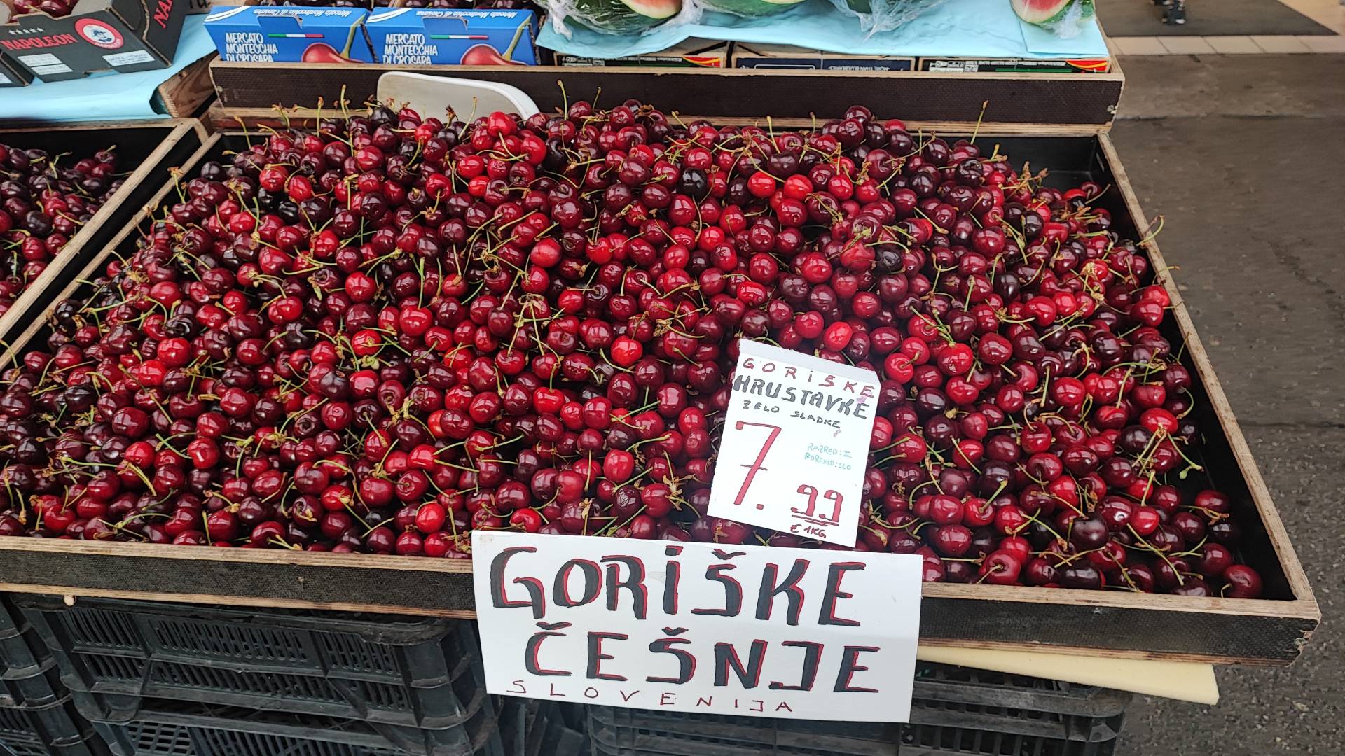 Preverjali smo jih v sredo. V nasprotju s pričakovanji cene slovenskih češenj še niso padle. Domače – iz Brd in Vipavske – so prodajali po osem in celo deset evrov za kilogram.