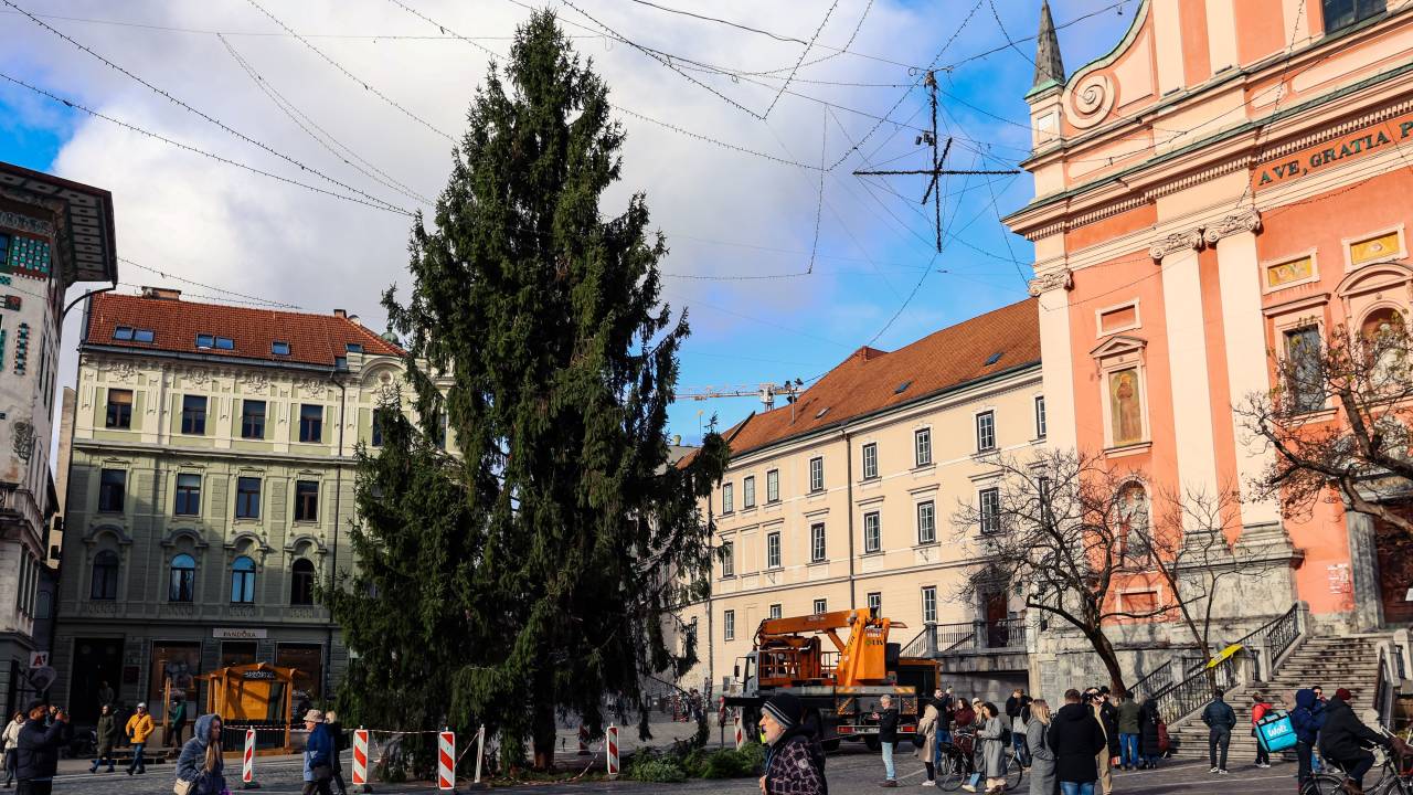 Praznična Ljubljana je že povsem zaživela – na Prešernovem trgu stoji 18-metrska smreka iz Medvod, zdaj pa ji manjka le še ime.