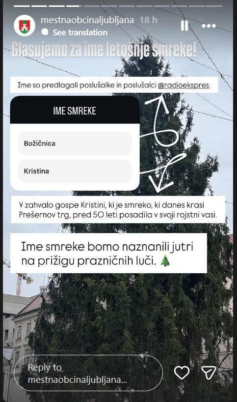 Še danes se glasuje na Instagramu Mestne občine Ljubljana. Koliko besede pri poimenovanju smreke na Prešernovem trgu pa ima pri imenu župan Zoran Janković?