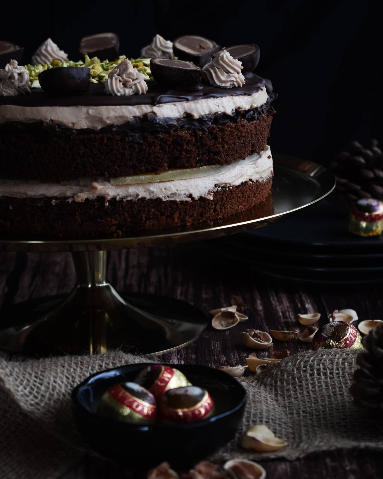 Torto sestavljajo zelo sočen kakavov biskvit z mletimi mandlji in lešniki, mascarpone krema z okusom nougata, čokoladni ganache s sesekljanimi pistacijami in plast marcipana.