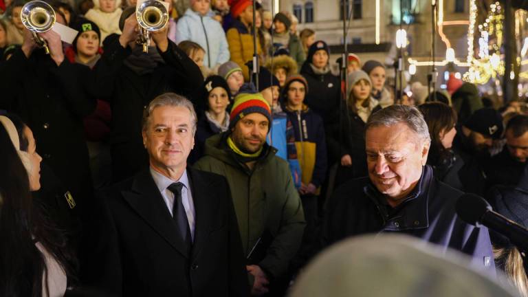 Osrednja smreka Božičnica zasvetila na Prešernovem trgu, Tina Gaber Golob pa je županu Zoranu Jankoviću prinesla presenečenje v obliki poljubčka.