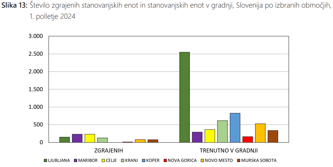 V prvi polovici leta 2024 je bilo v Sloveniji dokončanih okoli 900 novih stanovanj, večinoma v večstanovanjskih stavbah. Največ novih stanovanj je bilo zgrajenih na območju Maribora in Celja, sledi Ljubljana.