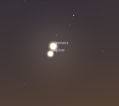 Konjunkcija planetov Venere in Jupitra se bo zgodila v četrtek, 2. marca, ob 18.30. Takrat se bosta oba planeta nahajala visoko nad obzorjem, oziroma bosta zelo blizu skupaj.