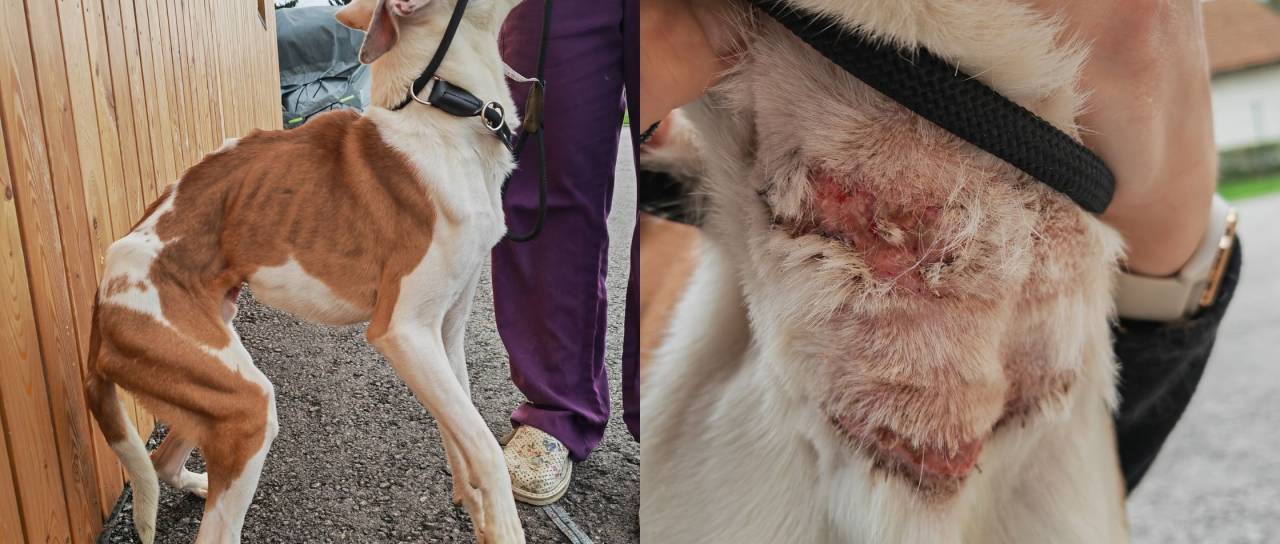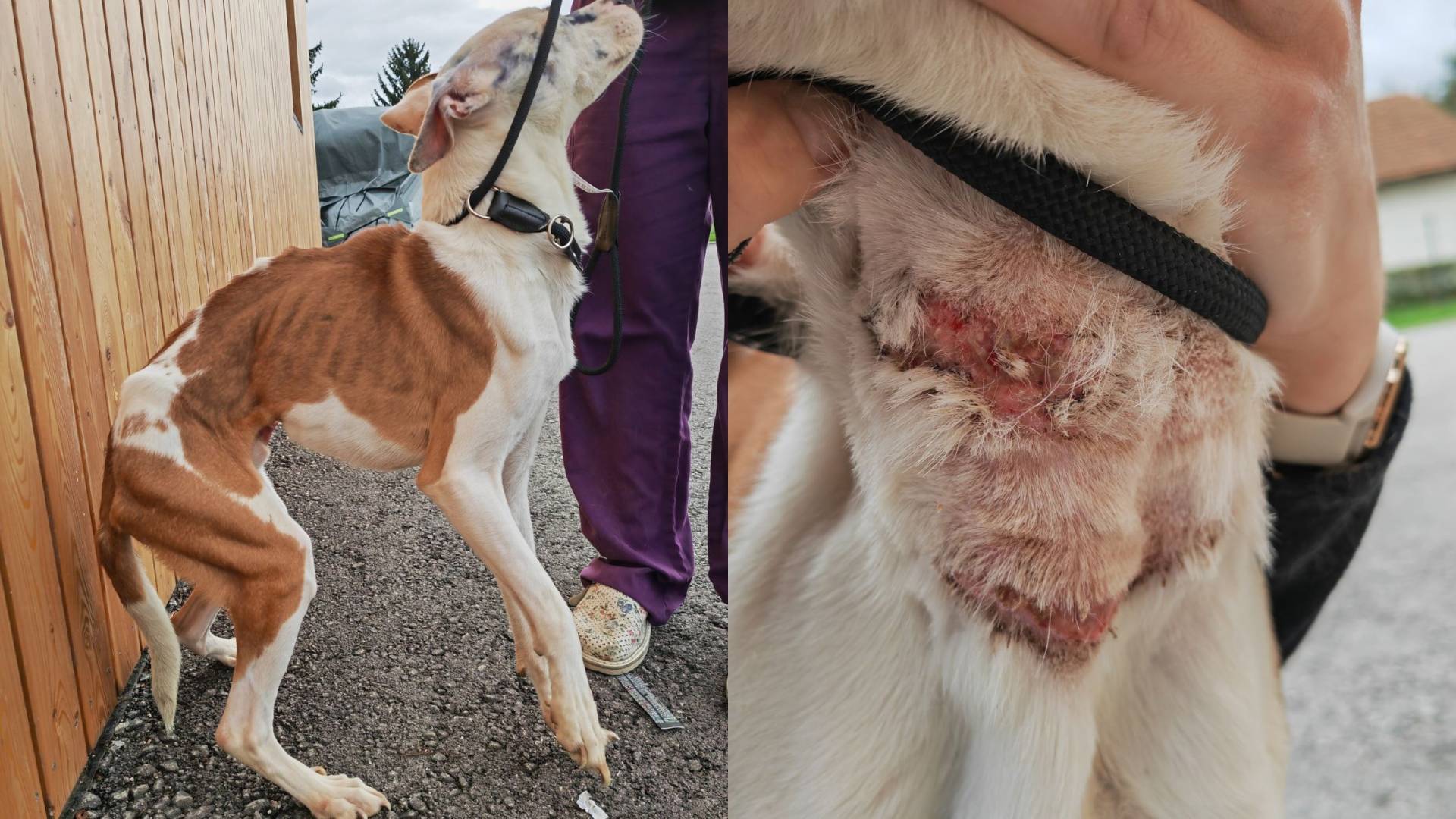 »Danes sprejet pes v stanju, ki bi ga lahko opisali tudi kot "hudo mučenje živali". Najden tavajoč na Teharski v Celju, popolnoma shiran, dobesedno kost in koža, z ranami od ketne okoli vratu, s predolgimi kremplji s katerimi le s težavo hodi, po glavi polit z nekakšno barvo, skrajno lačen, sestradan ... Za zjokat.«
