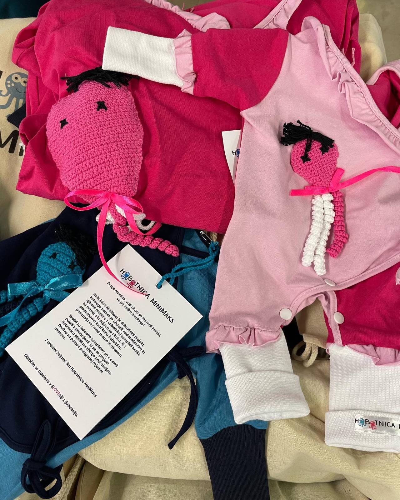 Cvetka je skupaj z Majdo Kuzmič ročno izdelala tudi aplikacije s kvačkanimi hobotnicami, ki so jih nakvačkale Magdalena Lovrak in prostovoljke Projekta Hobotnica. Ročno in slovensko izdelavo tunik in pajacev je s šivanjem zaokrožila Metka Fartelj (NMAJ Atelier).