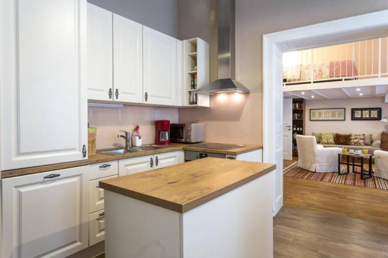 Na voljo je za 8 gostov, ima tri spalnice in tri kopalnice. Ena od spalnic ima galerijo s posteljo, pod galerijo pa je raztegljiv kavč z dvema ležiščema. V apartmaju so sodobno opremljena kuhinja z jedilnico in pomivalnim ter pralno-sušilnim strojem.