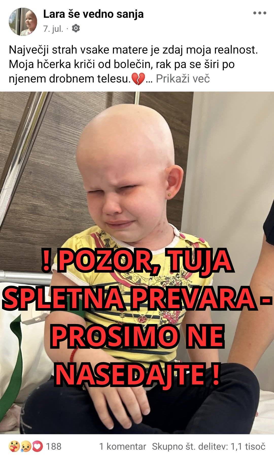 Na Facebooku se je namreč pojavila lažna stran z zgodbo o štiriletni deklici Lari, ki naj bi imela smrtonosnega raka, starši pa naj bi zanjo zbirali denar za zdravljenje v ZDA.