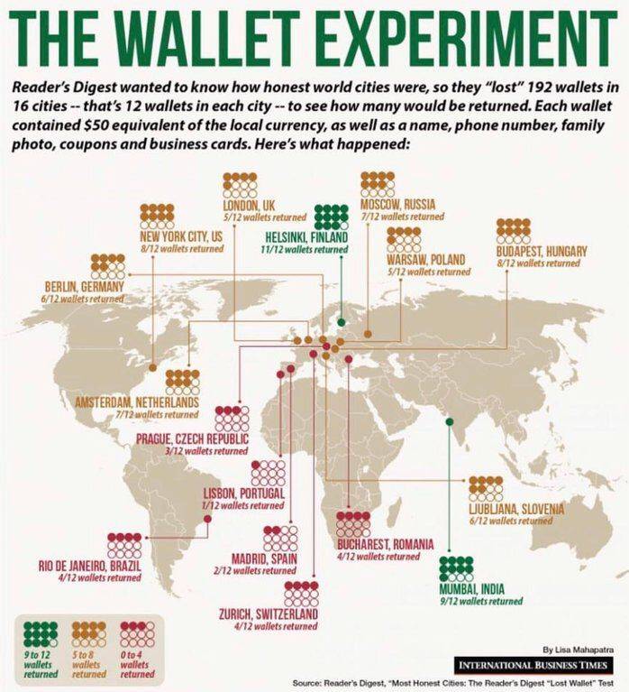 Ravno tovrsten eksperiment je izvedla publikacija Readers Digest, ki je širom sveta »izgubila« 192 denarnic z imenom, telefonsko številko, družinsko fotografijo, vizitko in približen ekvivalent 50 ameriškim dolarjem v gotovini.