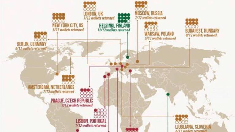 Najbolj pošteni ljudje živijo v Helsinkih, glavnem mestu Finske. Število vrnjenih denarnic: 11 od 12.