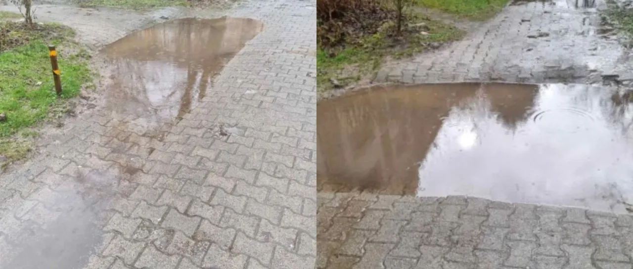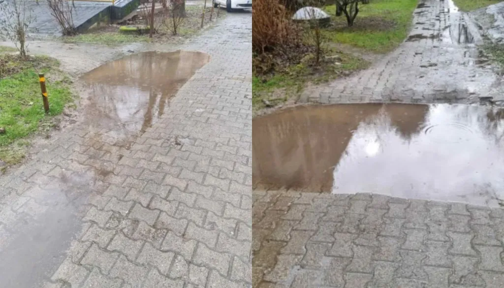 Pot je tlakovana, a številne poškodbe, manjkajoči tlakovci in pogoste luže po dežju onemogočajo varen prehod. Občani poročajo o več padcih, ki so jih povzročile luknje v tlakovcih.