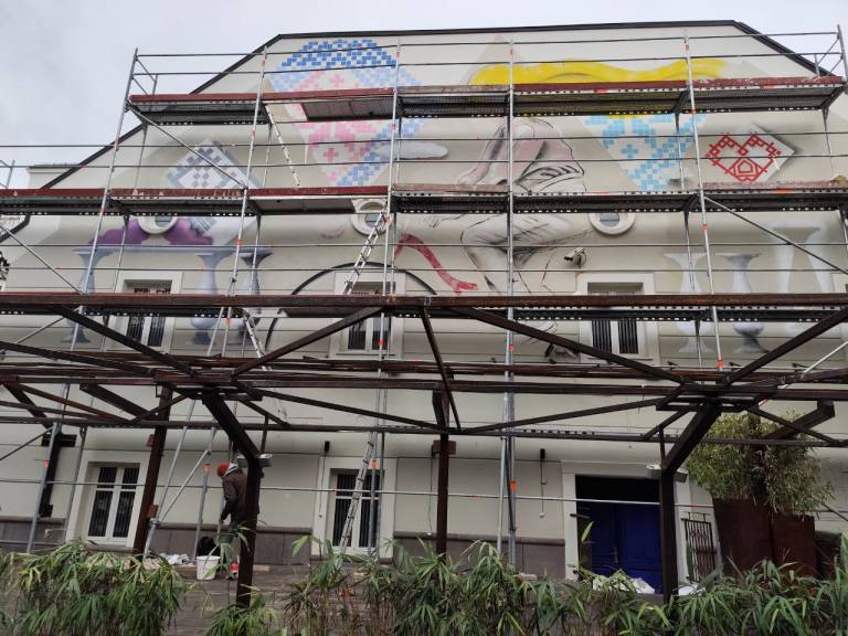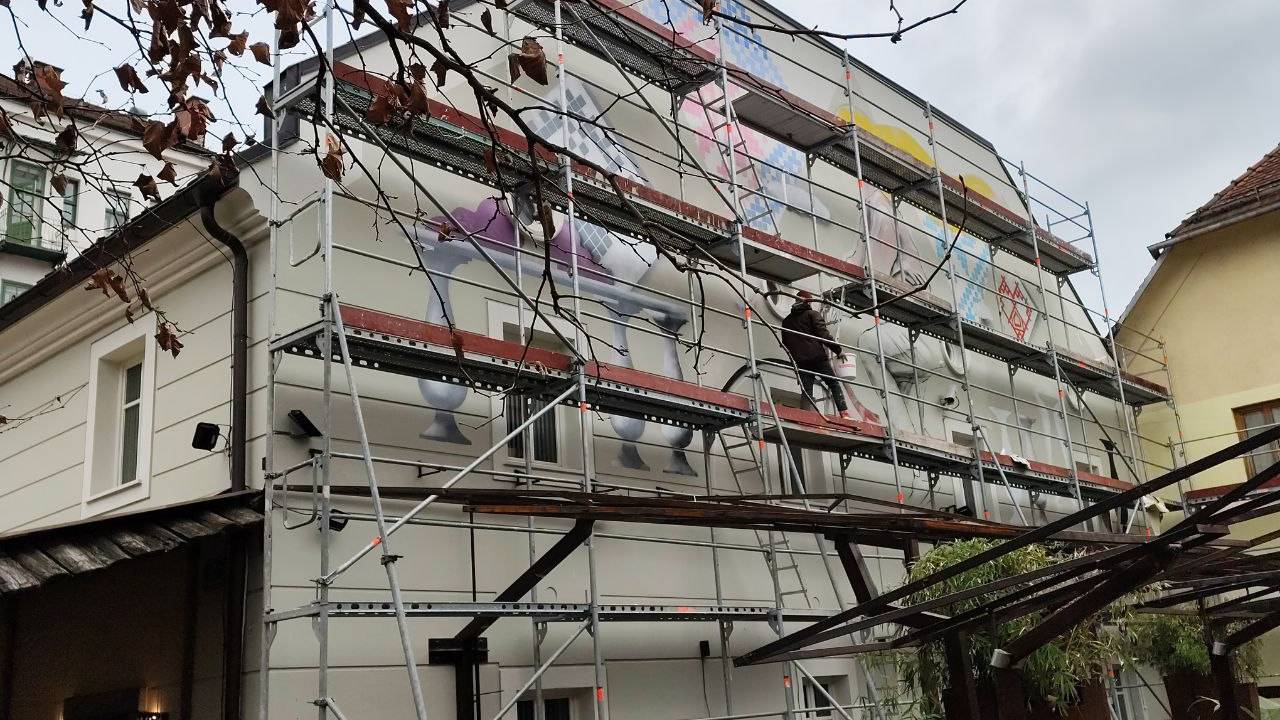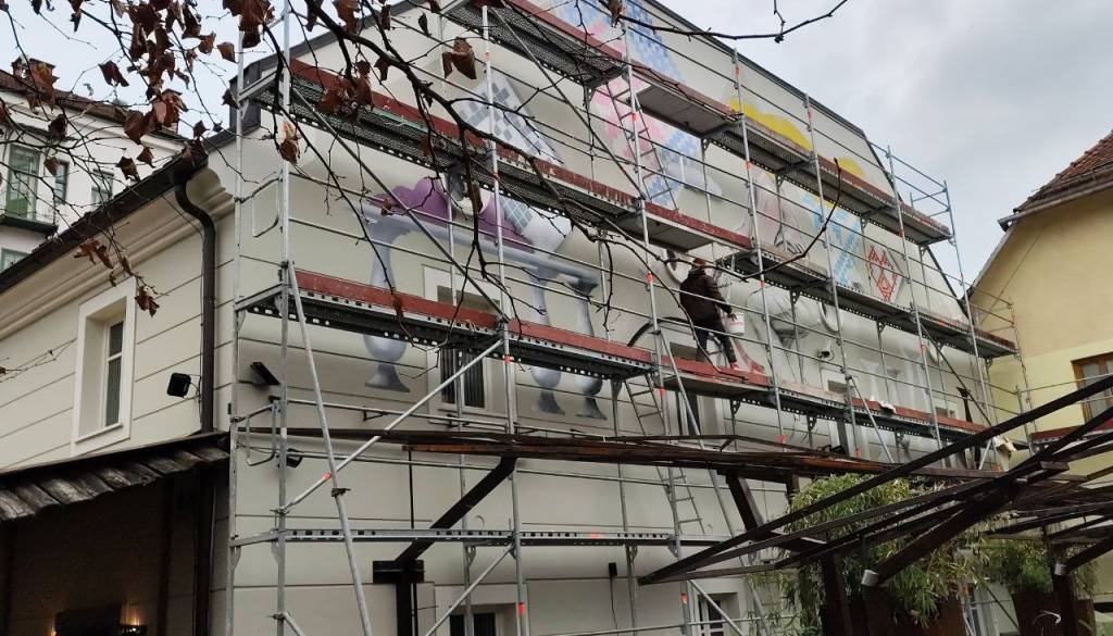 Na hiši vidimo vzorce in žensko, zidna poslikava je še v nastajanju. Kot nam umetnik pojasni, slika tradicionalne slovenske vzorce, v nastajanju je še dekle, ki jih šiva.