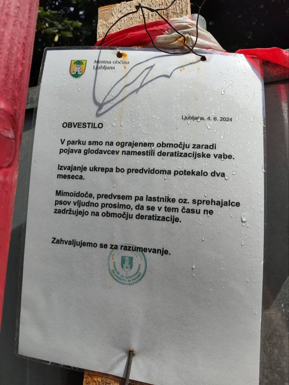 Na kovinski ograji, skozi katero se ne izmuzne nobena mačka ali kuža – upamo, da tudi podgana ne – so nalepljeni letaki v okviru akcije Človek, čuvaj svoje mesto, naj ljudje ne odmetavajo hrane prostoživečim živalim. To hrano pojedo tudi podgane. Hrane se ne odmetava niti v stranišča in odtoke – tudi ta hrana je nato na voljo podganam.