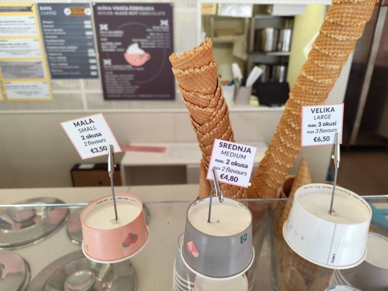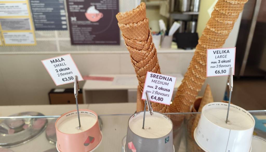Tam stane mala kepica z dvema okusoma 3,50 evra, srednja 4,80 in velika s tremi okusi 6,50 evra.