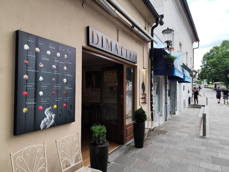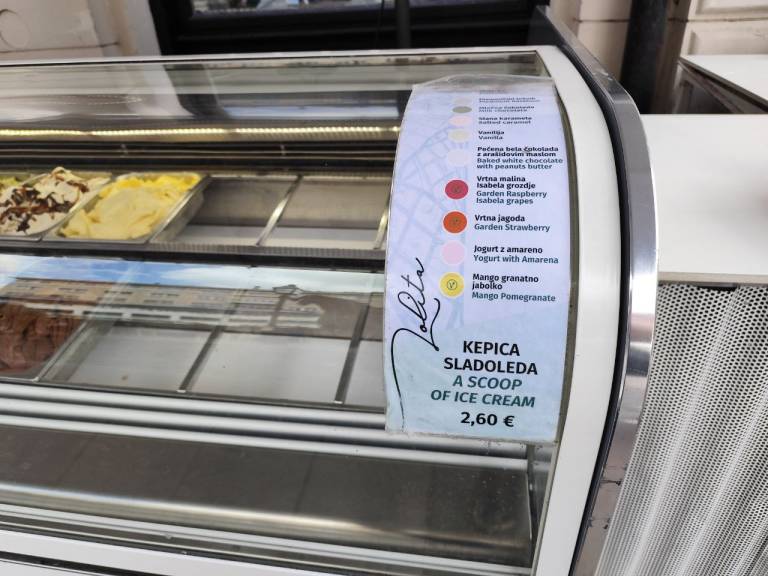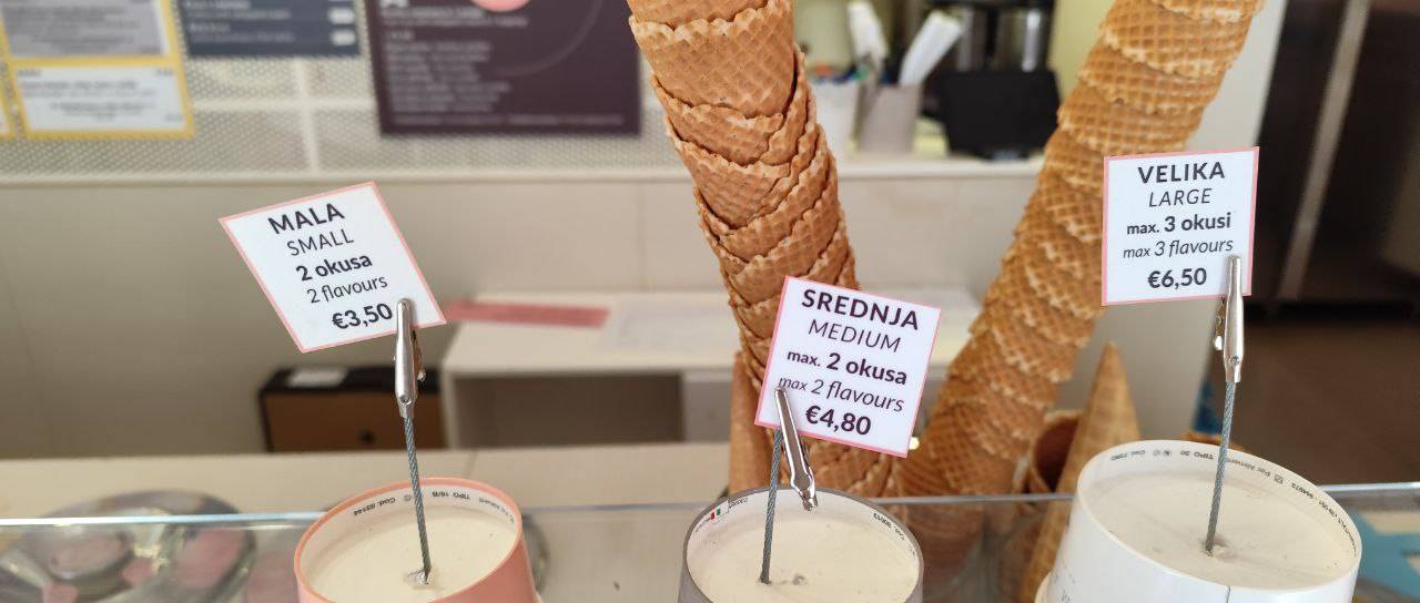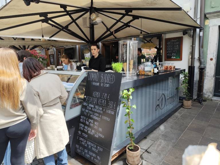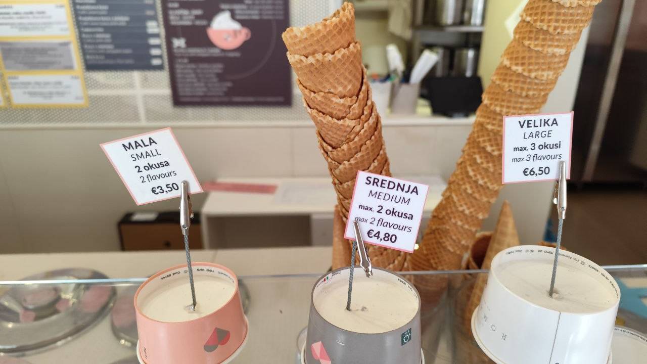Malce naprej Divine ponuja domači sladoled za 2,70 evra za kepico, specialna kepica stane 3,50 evra.