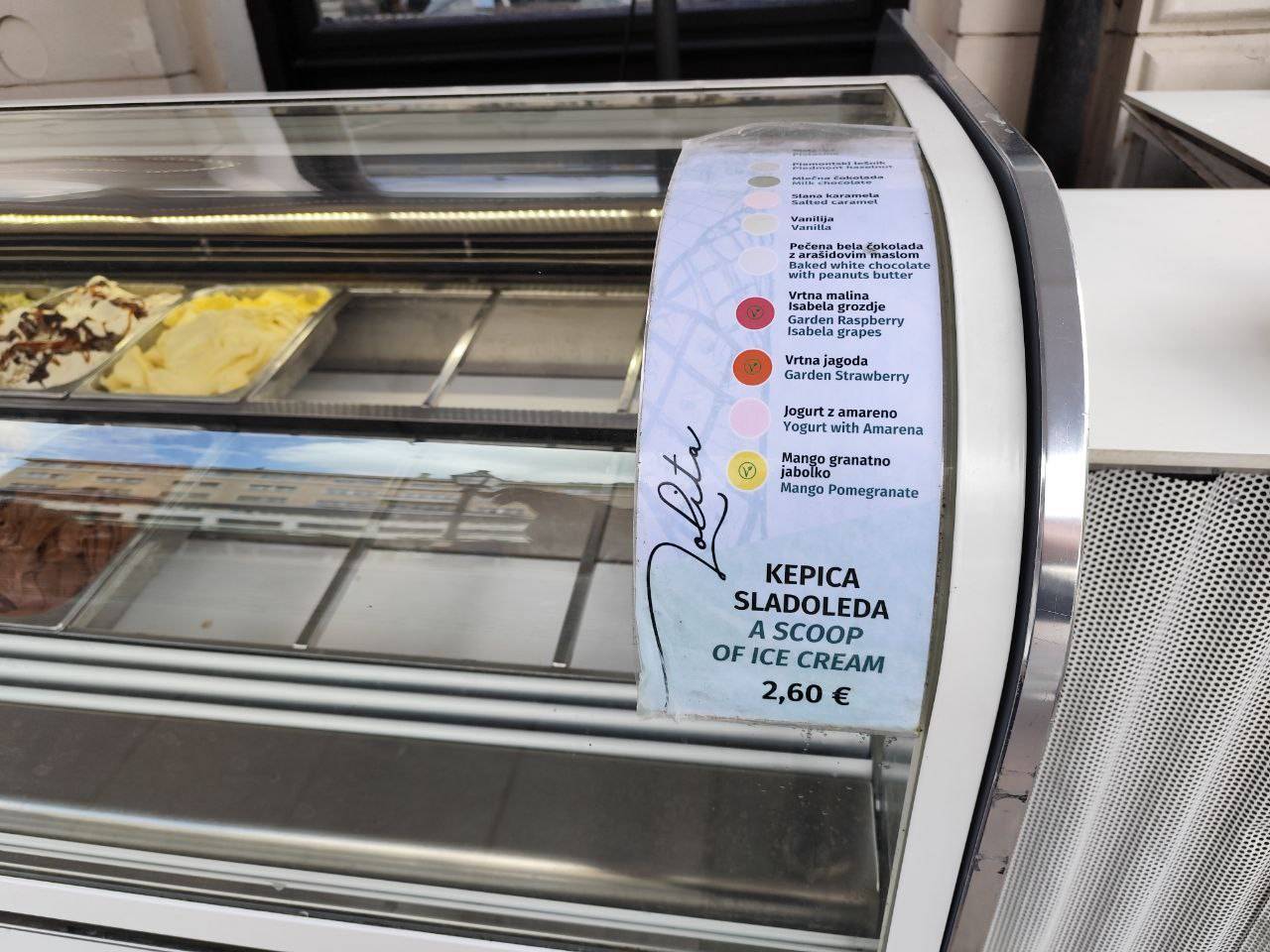 Doplačati je treba tudi sladki kornet, ta stane 80 centov, ponujajo tudi brezglutenski kornet za 1,70 evra.