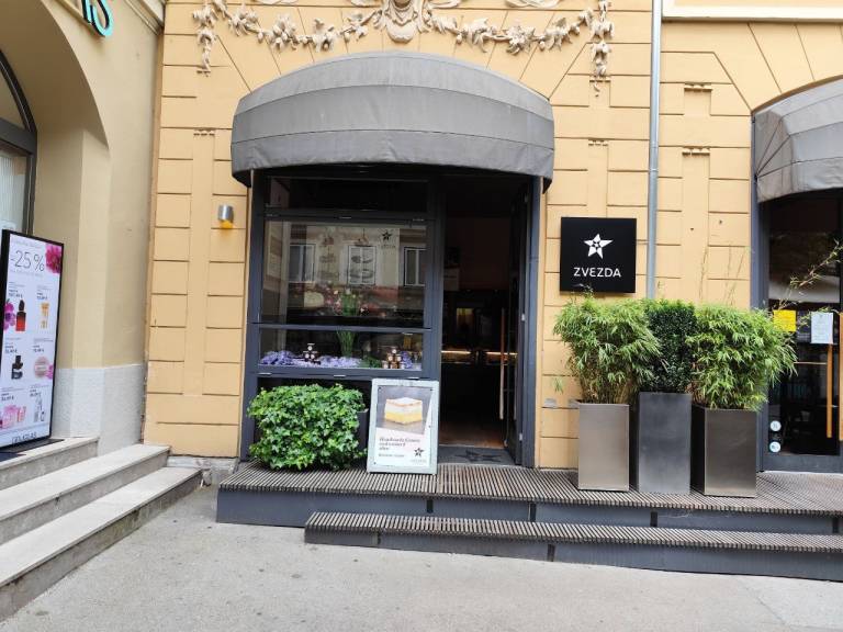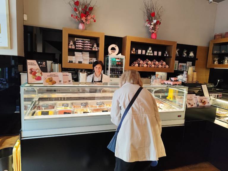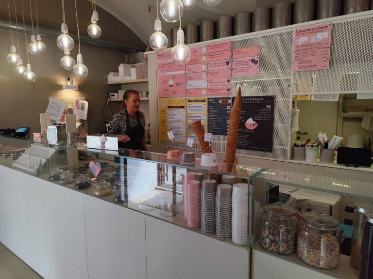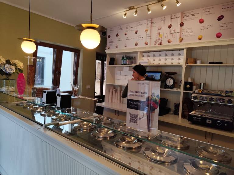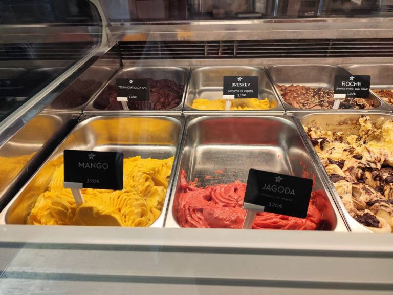 Na koncu smo se ustavili še pri delikatesi slaščičarne Zvezda, kjer se zaradi vremena sladoledne skrinje še niso postavili na ulico, a v notranjosti že ponujajo nekaj okusov.